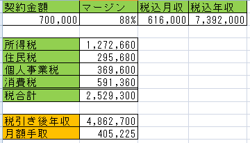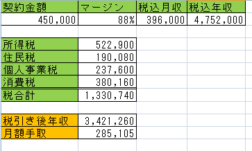 その中の、一番多い契約金額45万円で手取り額を計算してみた。